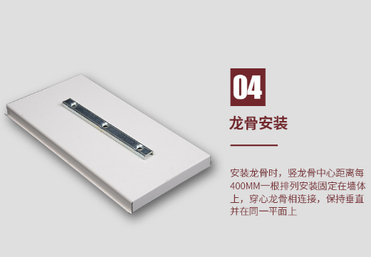 1、安裝龍骨時(shí),豎龍骨中心距離每400mm一根排列安裝固定在墻體上,穿心龍骨相連接,保持垂直并在同一平面上。