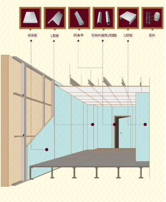 表面材料:鍍鋁鋅鋼板0.5/0.6/0.8MM,表面涂層:梅花白烤漆厚度≥25UM;靜電粉末涂層厚度≥45UM,鋼板背襯復(fù)合12MM法國(guó)圣戈班石膏板。