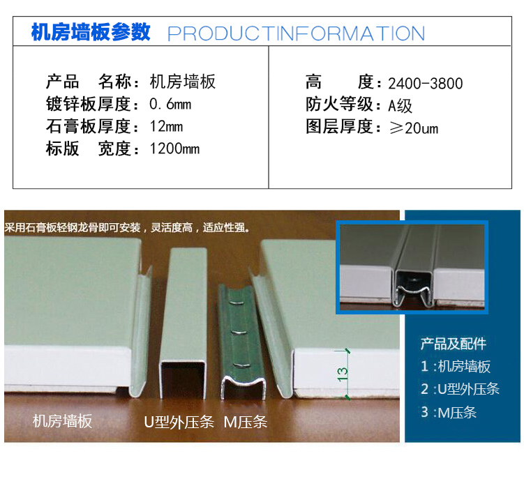 表面材料:鍍鋁鋅鋼板SGCC T=0.5/0.6/0.8MM,表面白色烤漆:環(huán)保聚氨酯涂層厚度≥25UM;鋼板背襯復合12MM優(yōu)質(zhì)石膏板。