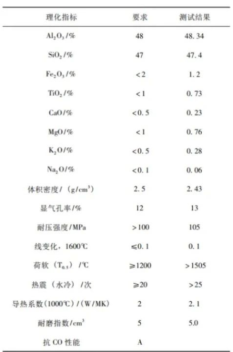 沸騰氯化爐內(nèi)襯材料主要采用Al?O?和SiO?,物相組成主要為莫來石,主要化學成份及物理性能測試見表1。