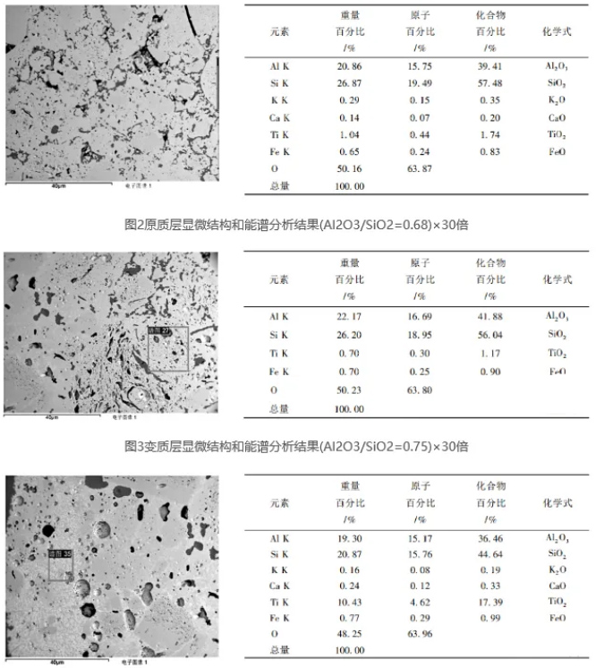從熱力學上看,Al?O?-SiO?系材料[4]各物相在氯化反應中:莫來石相(A?S?)非常不穩(wěn)定,其成份見表2,石英相(SiO?)非常穩(wěn)定,剛玉相(Al?O?)居中;在碳熱還原中:石英相非常不穩(wěn)定,剛玉相非常穩(wěn)定,莫來石相居中。在實際中,爐襯材料是如何損壞的,其過程是怎樣發(fā)生的,這要從殘磚顯微結(jié)構(gòu)分析入手。