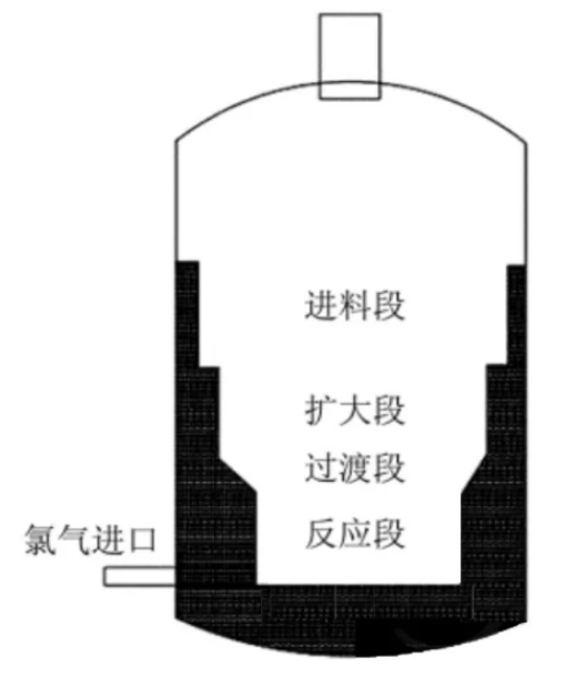 2、擴大段。沸騰氯化爐上部是用于降低氣流速度,而使得未反應的物料在重力作用下返回至反應段繼續(xù)進行反應,有效利用物料。