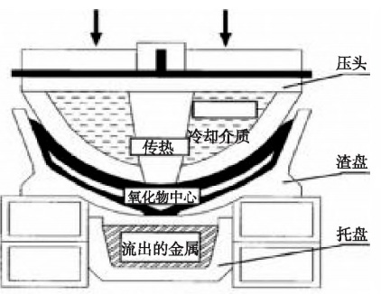 壓榨回收法的工作原理是將熱鋁灰從壓濾機上部裝入,對熱鋁灰施加靜壓或者動壓,將熔融鋁擠壓出。例如SPM法、MADOC法、COMPAL法、Thepress法等,原理如圖2所示。壓頭施加壓力,爐渣內的金屬受壓流向下層容器,在此期間鋁灰氧化迅速停止,形成的金屬殼將氧化物包裹起來,這樣既可以控制灰塵,也能減少煙氣的排出,而熱量由循環(huán)冷卻水帶走,爐渣的溫度逐漸降低到450℃以下,防止氧化的二次發(fā)生。