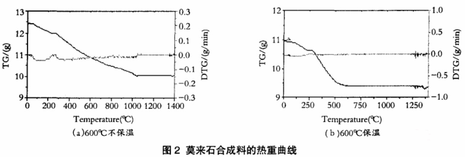 由于DSC-TG分析的測量用料量大多≤100mg,并且要磨成細(xì)粉。這種實(shí)驗(yàn)方法很難代表混合料實(shí)際的情況,且缺乏均勻性和代表性,從動(dòng)力學(xué)上也不能反映澆注料加熱過程的實(shí)阮變化情況。目前對(duì)于尺寸和質(zhì)量大的試樣,只能通過試樣加熱前后質(zhì)量的變化來表征總的反應(yīng)情況。用整體的樣塊大試樣加熱更接近真實(shí)。大試樣熱重儀對(duì)烘干后的試樣進(jìn)行熱重分析,測定室溫至1400℃過程中重量的變化,結(jié)果如圖2(a)所示。由圖可知,在連續(xù)加熱不保溫的情況下,質(zhì)量一直到1100℃才保持穩(wěn)定。根據(jù)DSC-TG及大試樣熱重分析結(jié)果,混合料在1200℃以上均可生成莫來石,只是莫來石的生成速度和轉(zhuǎn)化率隨溫度不同而會(huì)有所差異。本工作的主要目的是合成具有微孔結(jié)構(gòu)的莫來石骨料,既要求合成料有一定的氣孔率,孔徑小、體密輕,又要求其強(qiáng)度高,即要有理想的莫來石轉(zhuǎn)化率,同時(shí)還要兼顧煅燒設(shè)備投資、生產(chǎn)成本等,因此摸索理想熱處理制度對(duì)本工作而言至關(guān)重要。